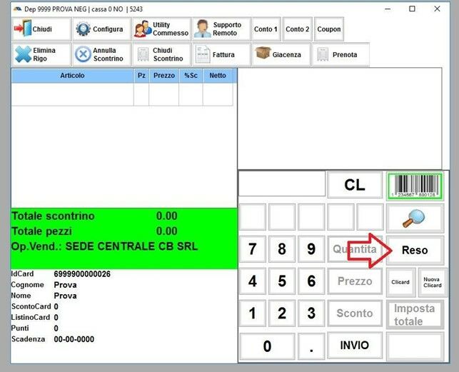 Dovrete andare ad inserire l’articolo che la cliente sta rendendo, se sono più di uno una volta inserito il primo si deve sempre cliccare su RESO ed inserirli ad uno ad uno, gli articoli resi saranno segnalati dal software in rosso e con segno negativo nella quantità dei pezzi.