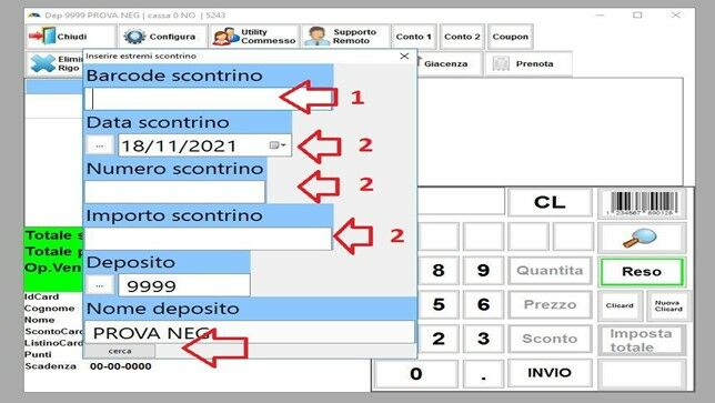 Si aprirà una schermata di controllo dello scontrino, andrete a leggere il CODICE A BARRE (1) dello scontrino che si trova alla fine dello scontrino, alcune stampanti fiscali non stampano un CODICE A BARRE ma stampano un CODICE CAMBIO si dovrà inserire manualmente, in caso lo scontrino non abbia ne CODICE A BARRE ne CODICE CAMBIO, si può procedere inserendo i dati manualmente (2) DATA SCONTRINO, NUMERO SCONTRINO, IMPORTO SCONTRINO, e poi cliccare su CERCA