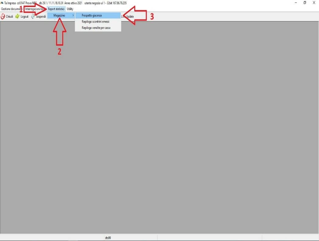 In questa guida andremo a vedere come si cercano le giacenze che ci sono all’interno del negozio, come prima cosa andremo a cliccare su REPORT STATISTICI (1) poi su MAGAZZINO (2) ed infine su PROSPETTO GIACENZE (3)