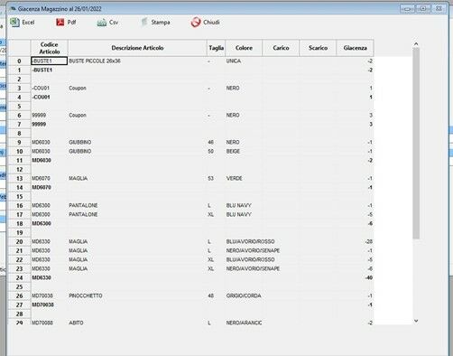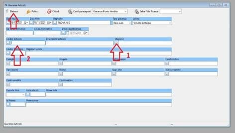 A questo punto andremo a fare ELABORA e comparirà una schermata con tutte le giacenze presenti nel negozio, la ricerca può essere fatta anche più specifica modificando alcuni campi della schermata tipo la STAGIONE (1) oppure inserendo un CODICE ARTICOLO (2) specifico, la schermata ci offre molte possibilità si devono inserire dei parametri in base alle esigenze specifiche