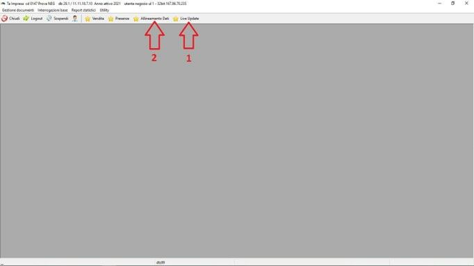 La procedura che andrà svolta ogni mattina all’apertura del programma è quella di avviare il “LIVE UPDATE” (1) e dopo aver completato l’aggiornamento avviare “ALLINEAMENTO DATI” (2). In questo modo avremo il programma sempre aggiornato all’ultima versione e allineato con il server principale.