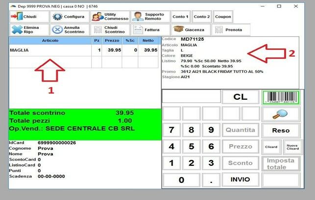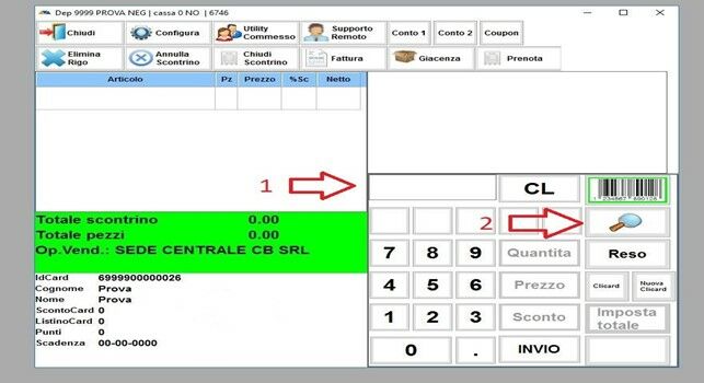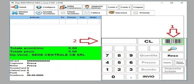 Adesso siamo pronti per inserire gli articoli che la cliente ha scelto di acquistare. Come prima cosa ci dobbiamo accertare che il contorno VERDE è sull’immagine del CODICE A BARRE (1), e poi cliccare sul rettangolo indicato nell’immagine (2), una volta selezionato il rettangolo diventerà VERDE e quindi si potrà procedere leggendo il CODICE A BARRE sul cartellino dell’articolo scelto dalla cliente.
