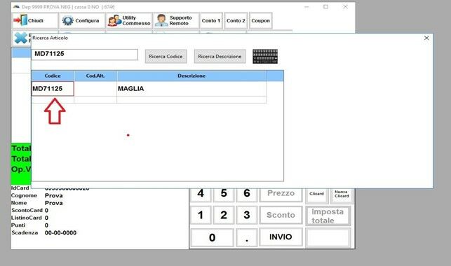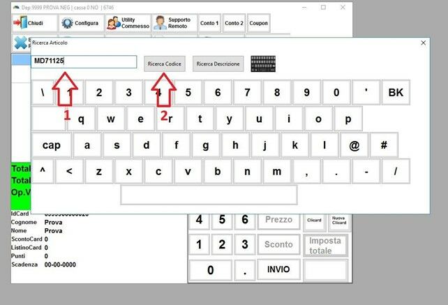 Si può cercare l’articolo anche scrivendo il CODICE ARTICOLO direttamente sul rettangolo e premendo invio (1) oppure premendo sulla lente di ingrandimento (2)