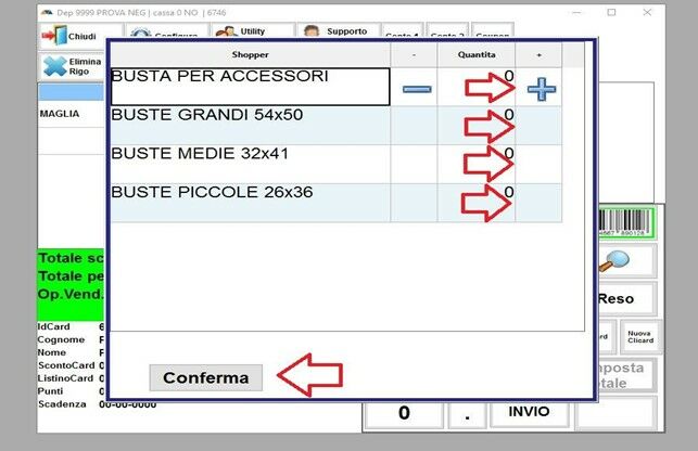 Si aprirà la schermata di scarico delle BUSTE DI VENDITA che darete al cliente e aumenterete tramite il segno + il numero di buste usate per poi cliccare su CONFERMA