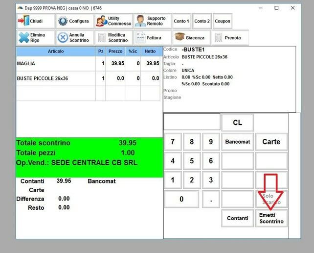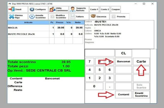 Una volta aggiunti tutti gli articoli della vendita, si procederà cliccando CHIUDI SCONTRINO
