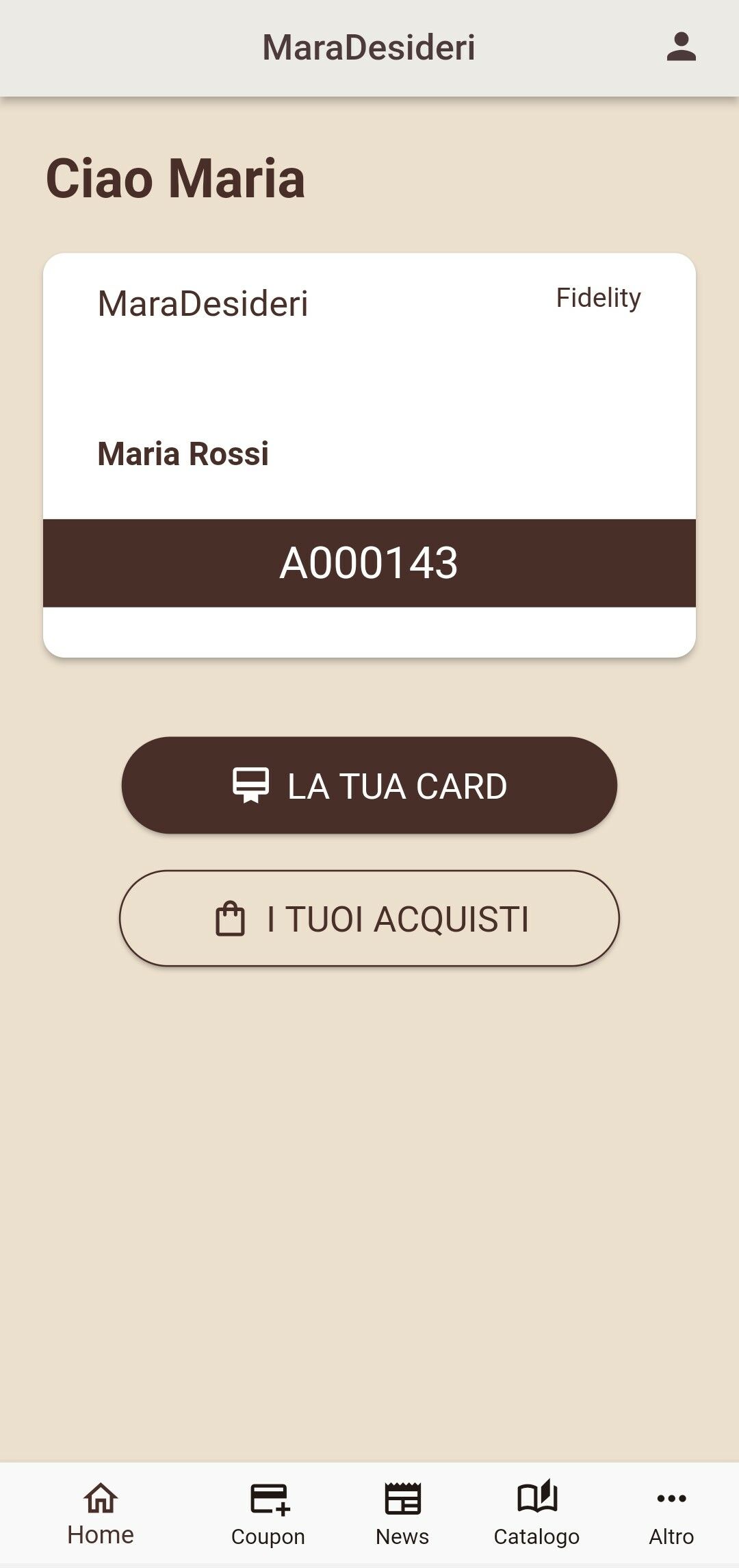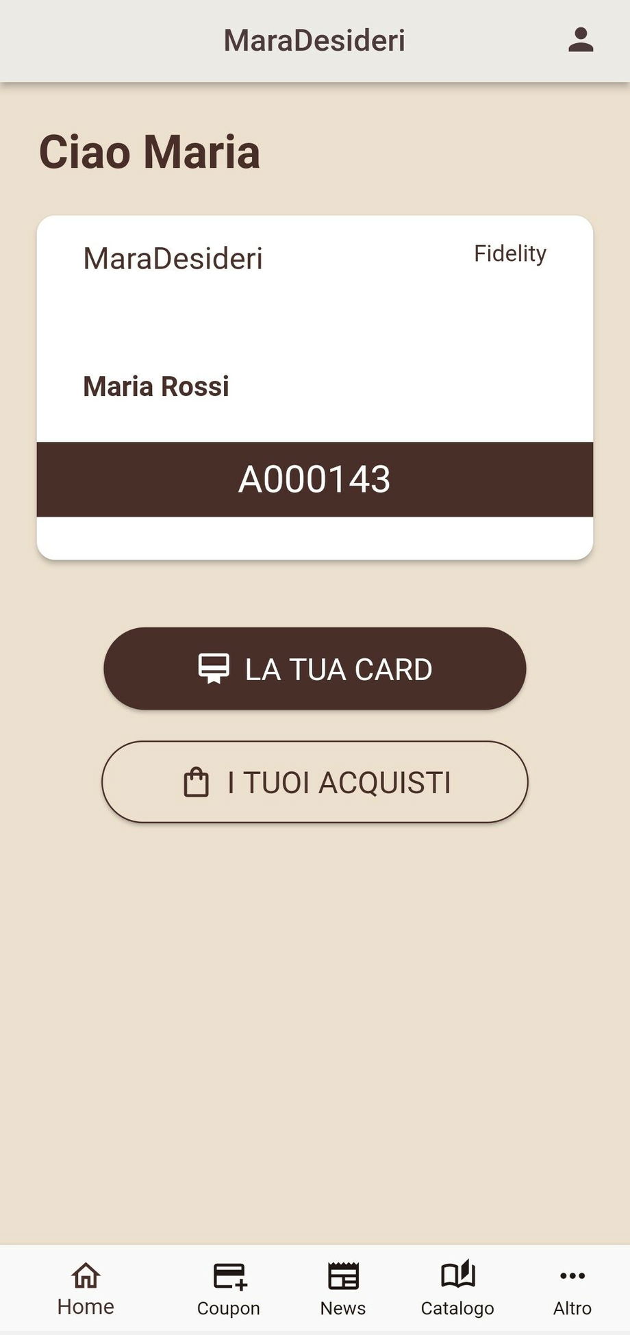 Dopo aver salvato si accederà all'app. Nella Home si visualizzerà il codice della fidelity e tutte le transazioni ad esse connesse. Nella schermata dei Coupon ci saranno tutti i buoni ed i coupon creati. Su News arriveranno le notifiche con le offerte in corso. Su Catalogo si visualizzerà sempre l'ultimo catalogo aggiornato e su Altro ci sarà una schermata riassuntiva delle funzionalità meno importanti.