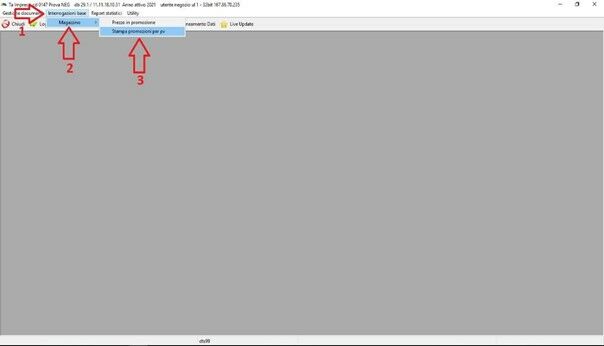 La lista articoli in promozione deve essere generata ogni volta che vi arriva una nuova circolare ed inizia una nuova promozione, come prima cosa andremo a cliccare su INTERROGAZIONI BASE (1) poi su MAGAZZINO (2) e infine su STAMPA PROMOZIONI PER PV (3)