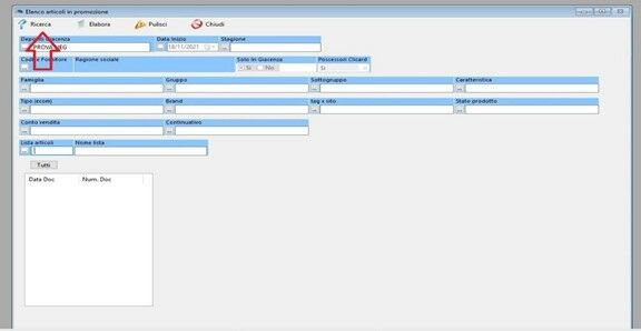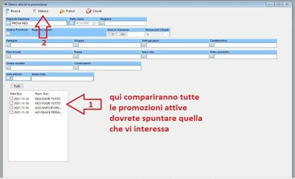 Andremo a selezionare la promozione di cui dovremo estrapolare la lista (1) e poi premeremo il tasto ELABORA (2)