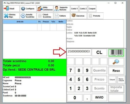 Ora andremo ad inserire a leggere il CODICE A BARRE PER GIFT CARD, codice che vi viene fornito dalla sede assieme a tutto il materiale che serve per le nuove aperture. Se dovesse mancare potrete contattare l’Amministrazione per riceverlo.